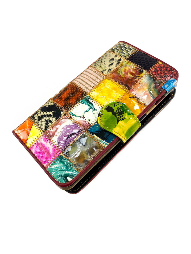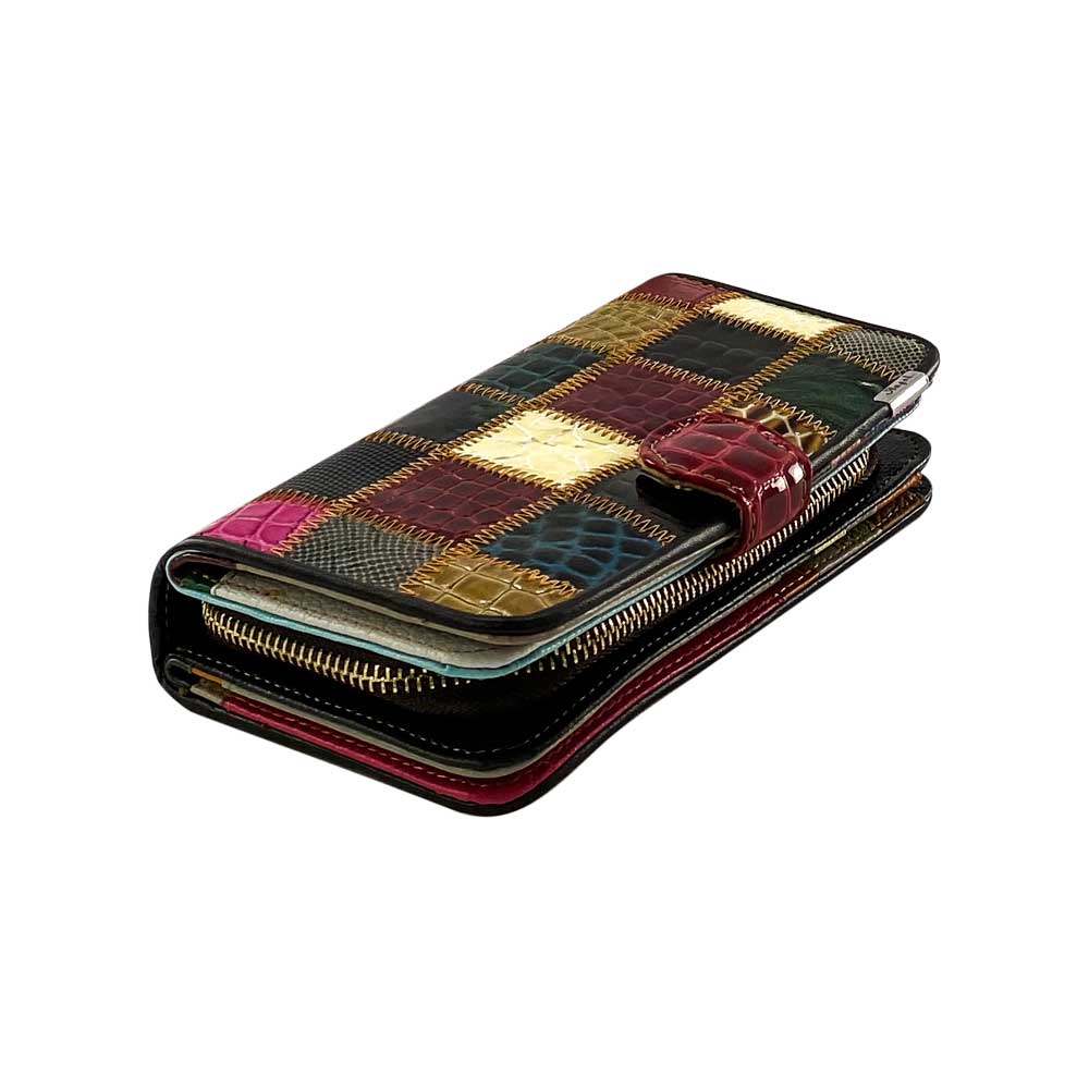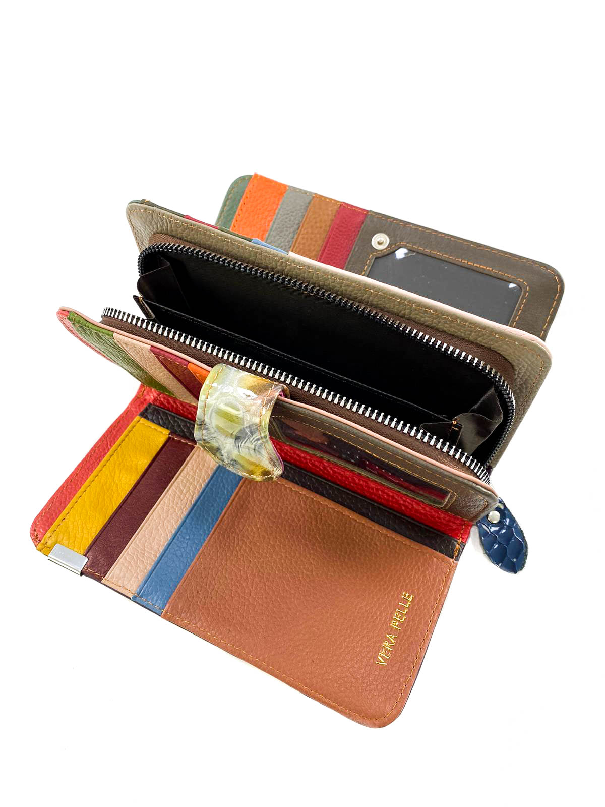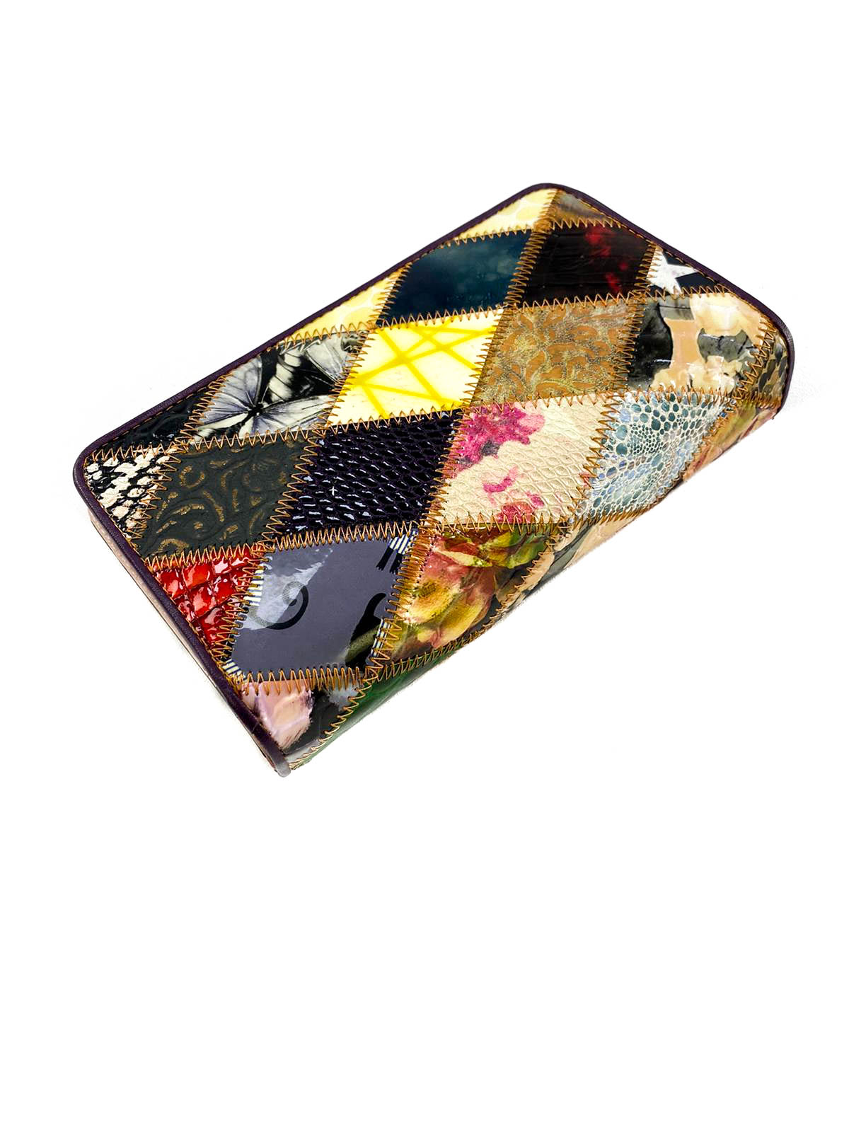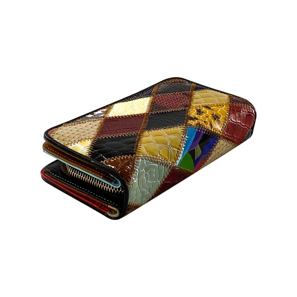 Portofelul de damă din piele multicoloră lucioasă Anda cu finisaj lăcuit și cusături maronii, lucrat din bucăți de piele naturală colorată dispuse sub formă de romburi sau carouri, este un excelent organizator, datorită interiorului cu trei compartimente, precum și a numeroaselor sloturi pentru carduri și cărți de credit.
