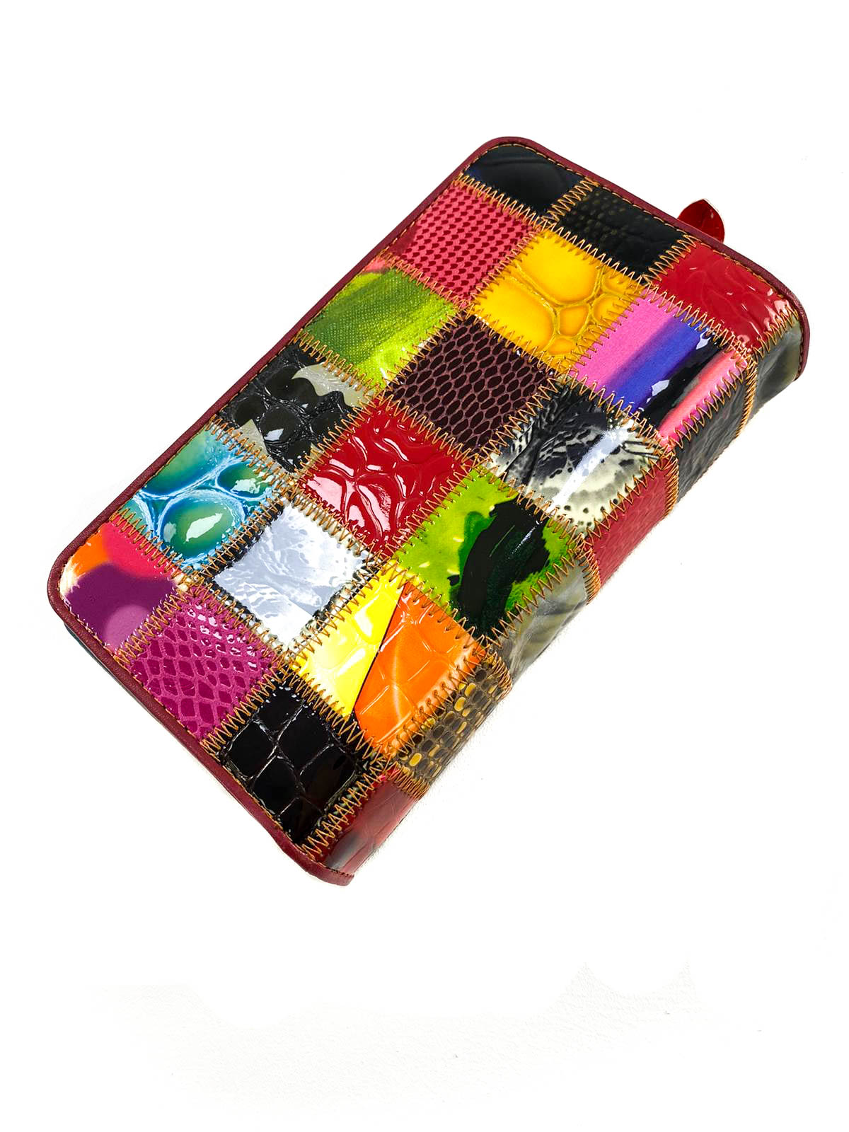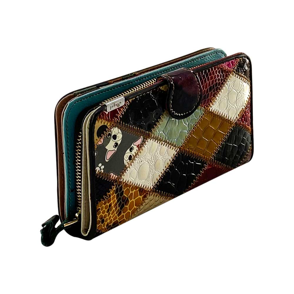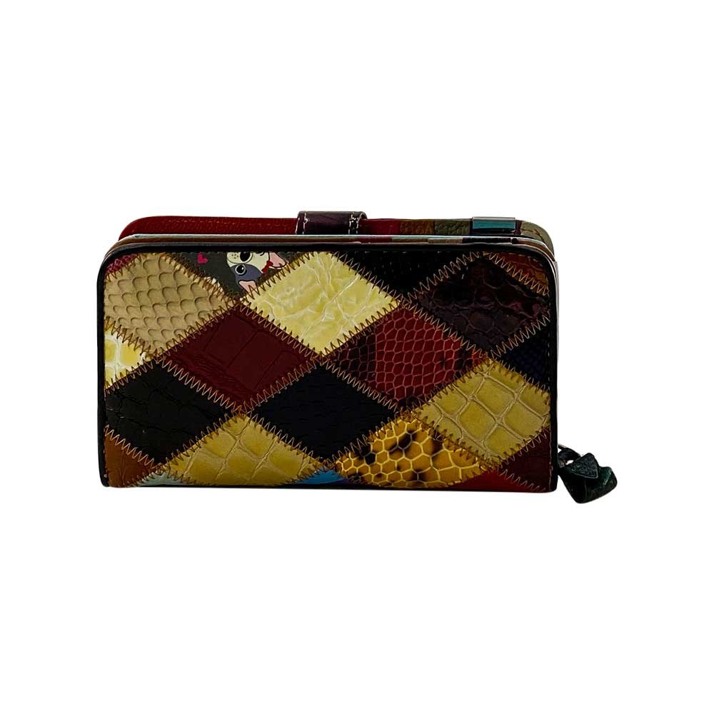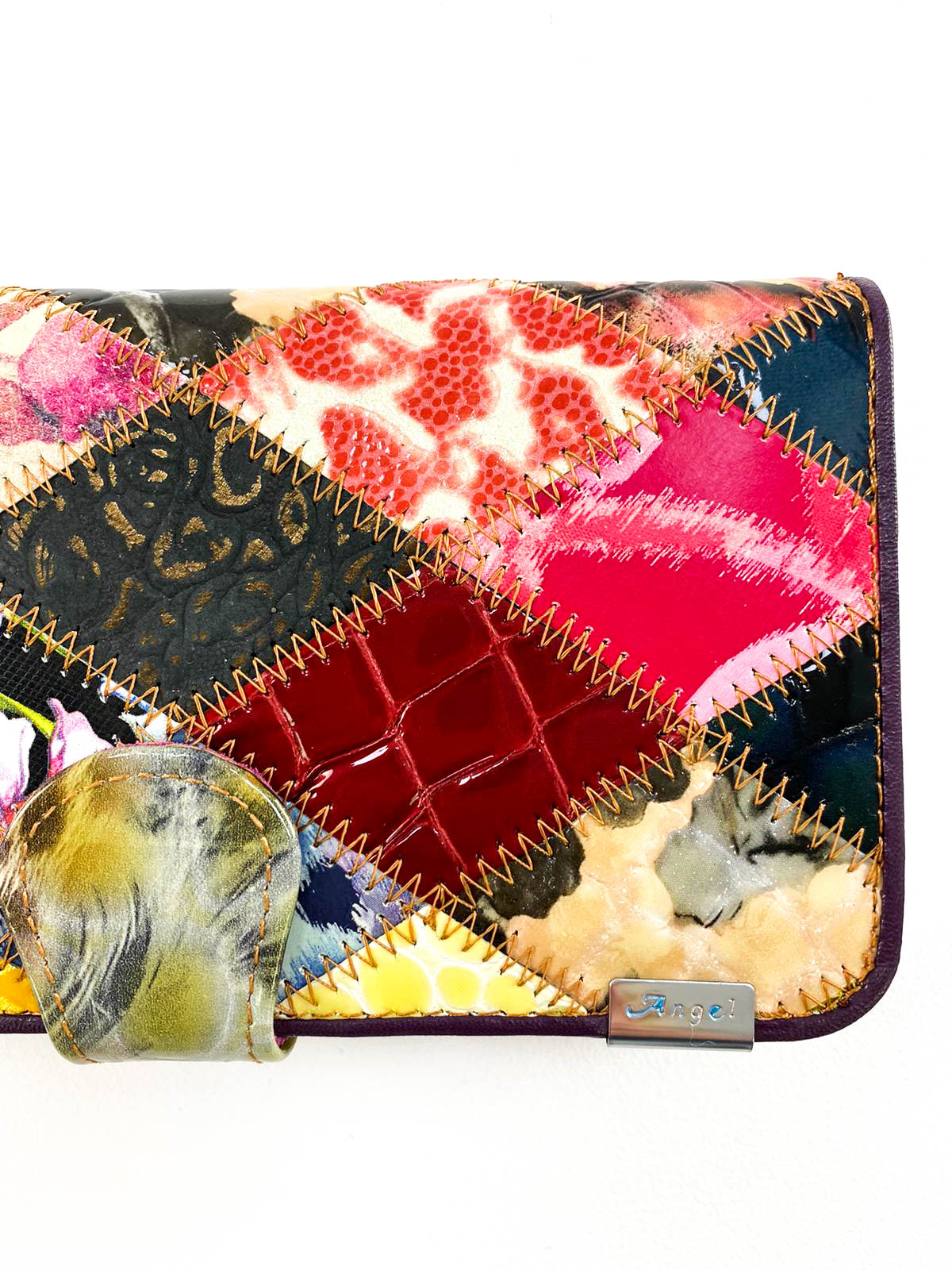 Portofelul de damă din piele multicoloră lucioasă Anda cu finisaj lăcuit și cusături maronii, lucrat din bucăți de piele naturală colorată dispuse sub formă de romburi sau carouri, este un excelent organizator, datorită interiorului cu trei compartimente, precum și a numeroaselor sloturi pentru carduri și cărți de credit.