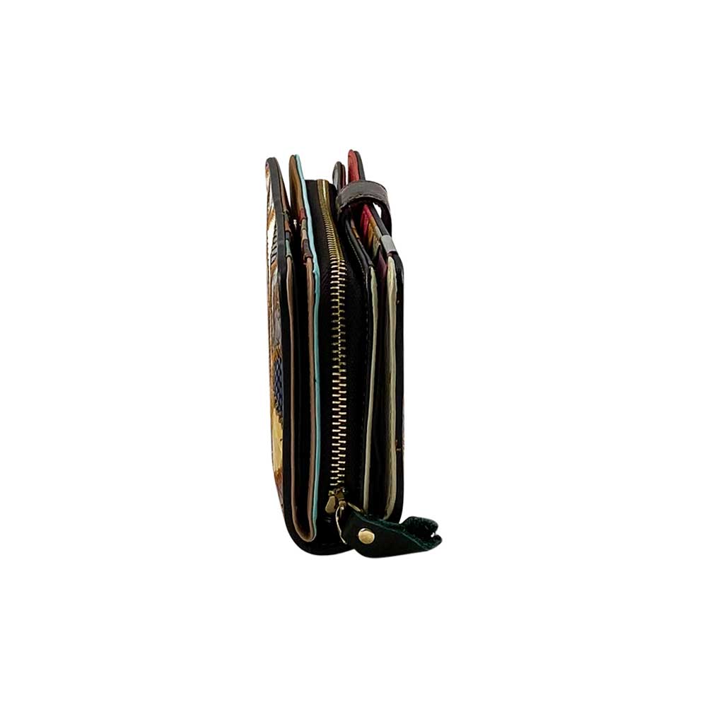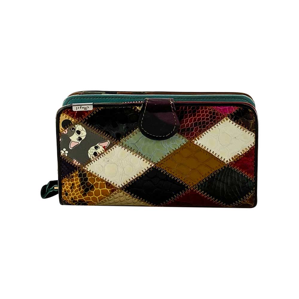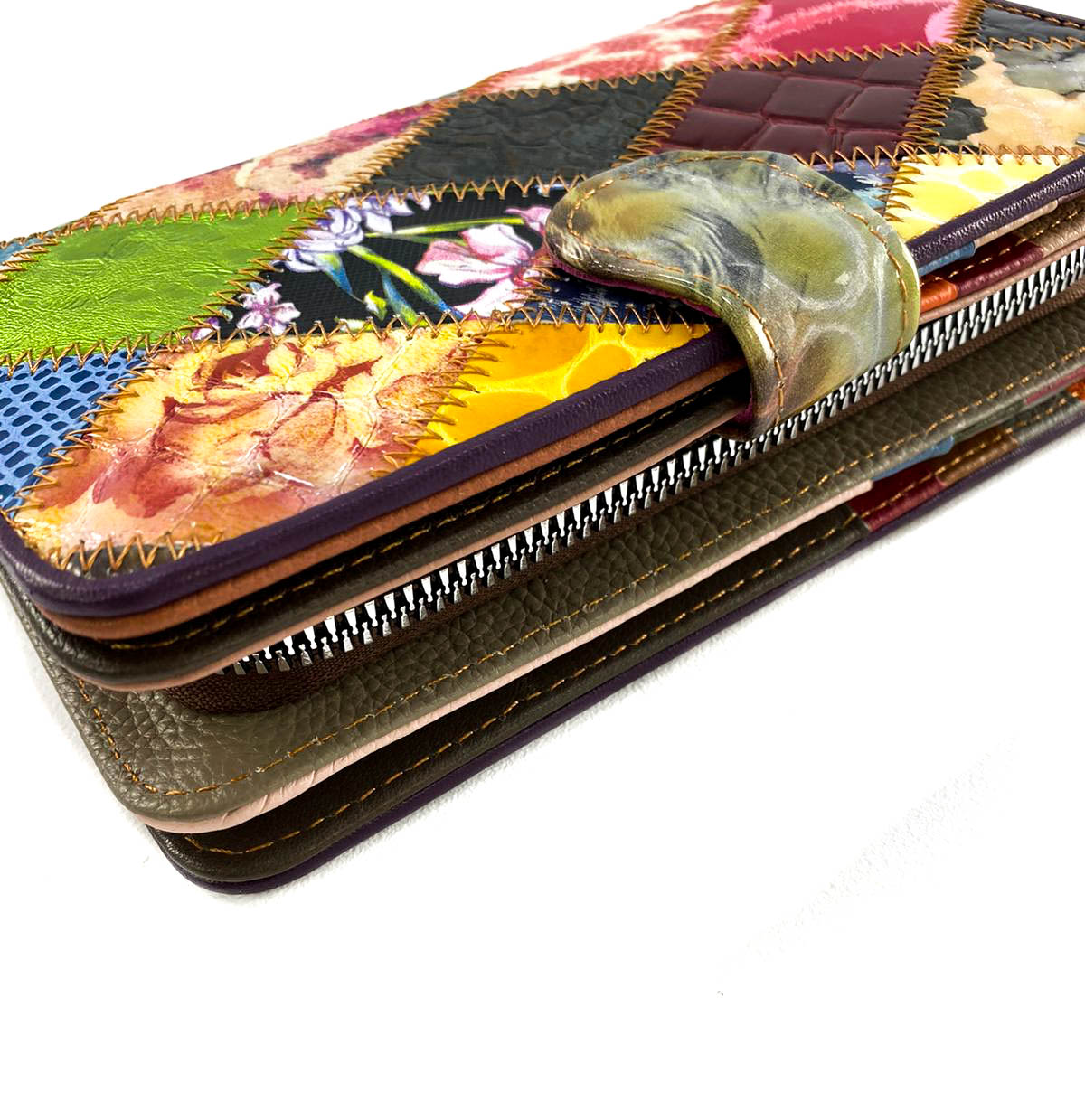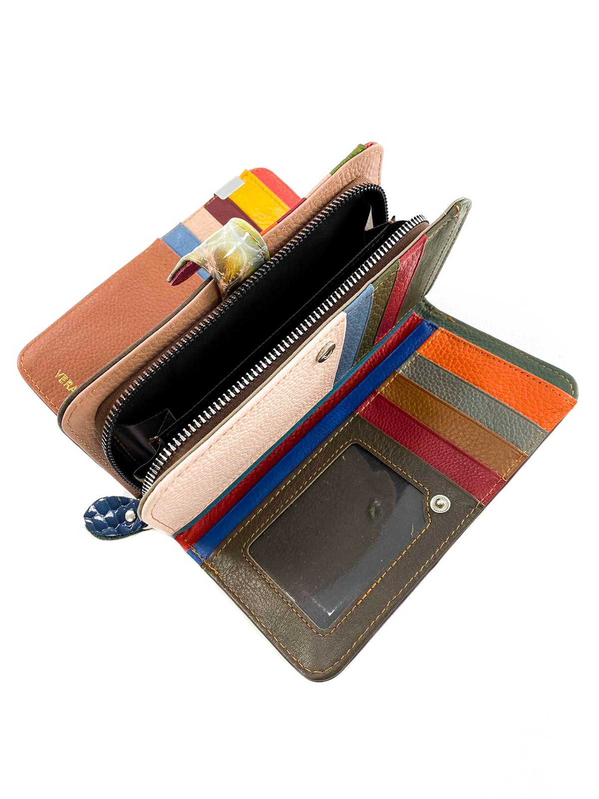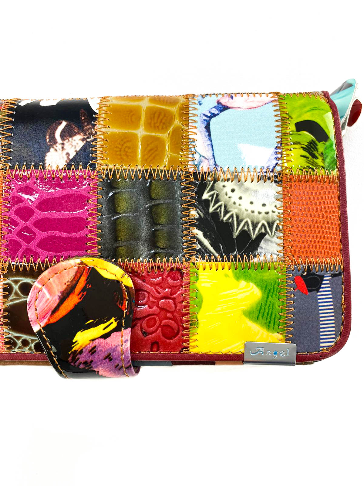 Portofelul de damă din piele multicoloră lucioasă Anda cu finisaj lăcuit și cusături maronii, lucrat din bucăți de piele naturală colorată dispuse sub formă de romburi sau carouri, este un excelent organizator, datorită interiorului cu trei compartimente, precum și a numeroaselor sloturi pentru carduri și cărți de credit.